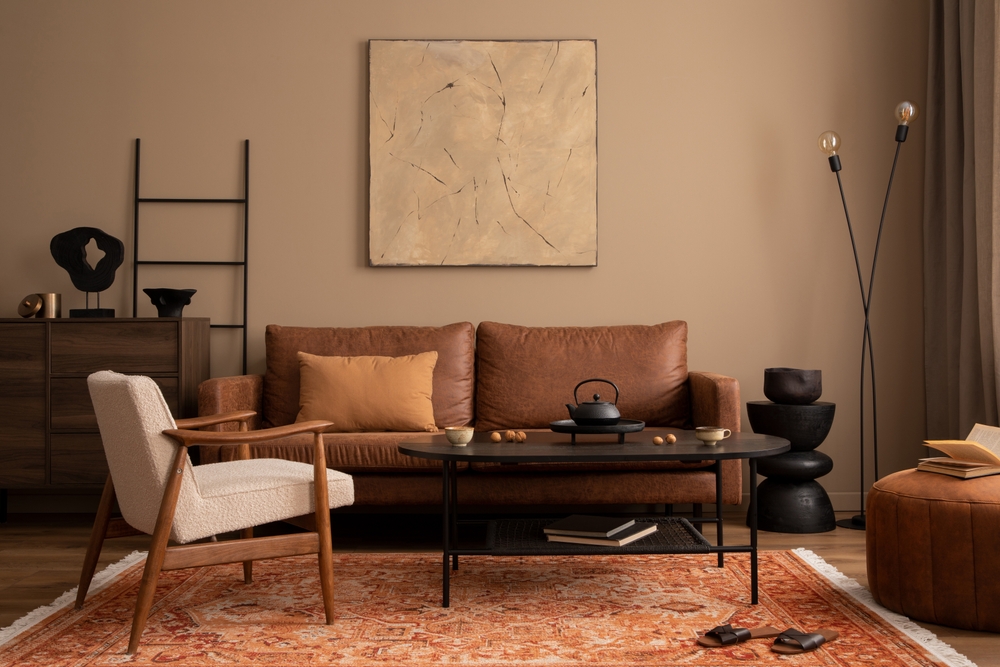 The Mocha Mousse sofa and pillows with red (warm shades) accents are a hit! It will be an ideal choice for those who do not like excessive contrasts between colors.