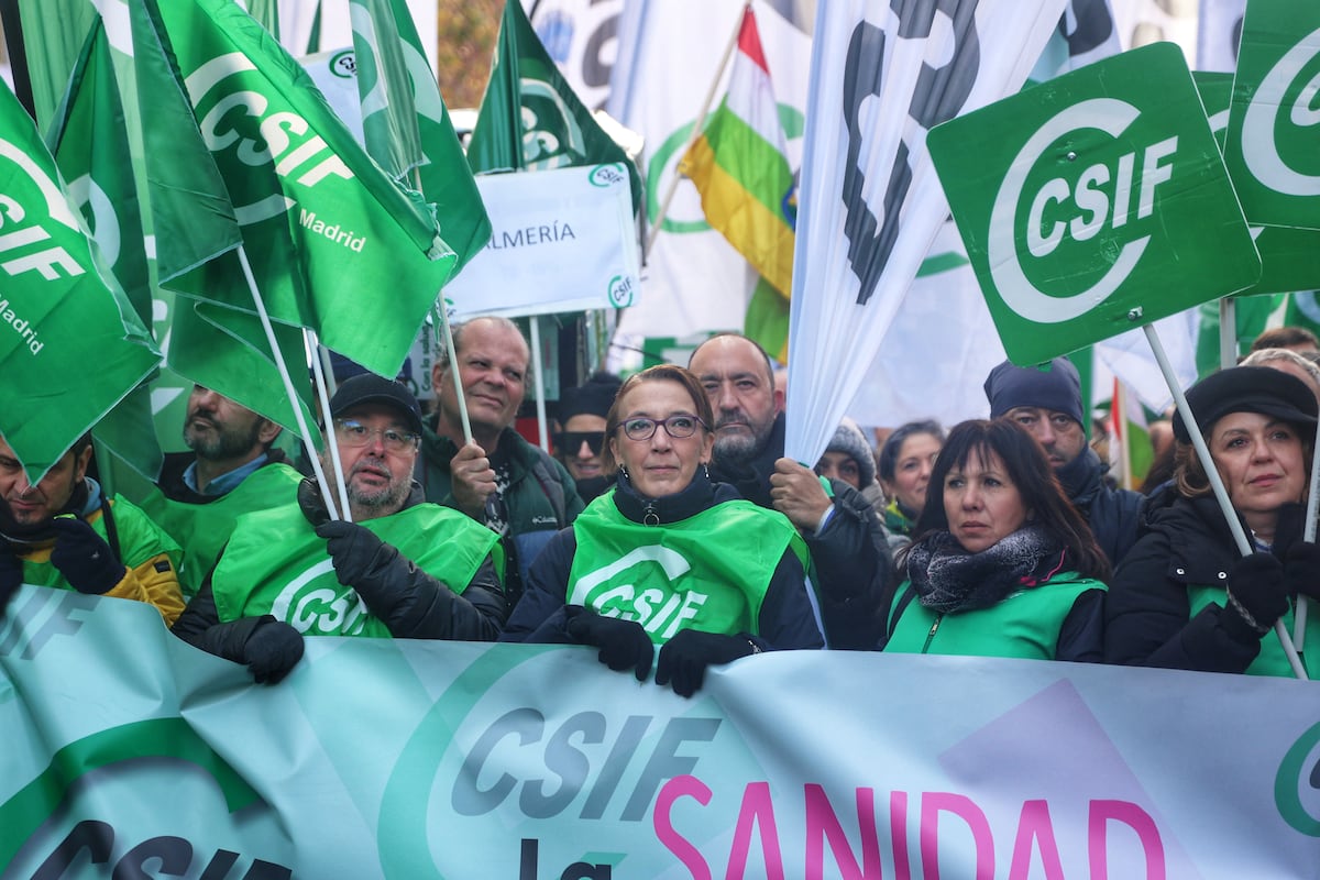 Thousands of officials summoned by the majority union in the public service, the Independent Trade Union Center and Civil Servants (CSIF), demonstrated this Saturday in Madrid after the open confrontation between the Government and the medical insurers to renew the current agreement, which expires at the end of the year. The organizers have estimated around 35,000 people gathered at the doors of the Muface General Directorate in Madrid. A figure that has been reinforced with the assistance of members of the Jupol Police union and the Civil Guard union, Jucil. “We do not rule out any pressure measure, including a strike in public administrations,” warned the president of CSIF, Miguel Borra, while criticizing the fact that government parties such as Sumar do not support it.