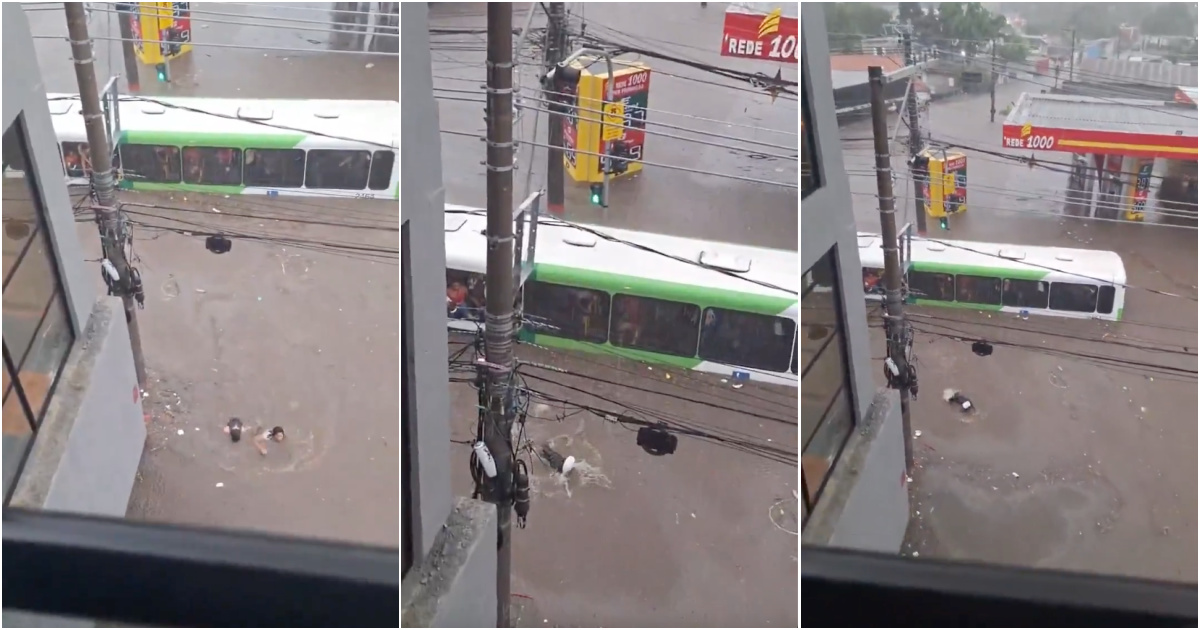 The strong storm that hit Guarulhos, in São Paulo, Brazil, on the afternoon of Monday, left several streets flooded, forcing the passengers of a bus leaving the vehicle… swimming.