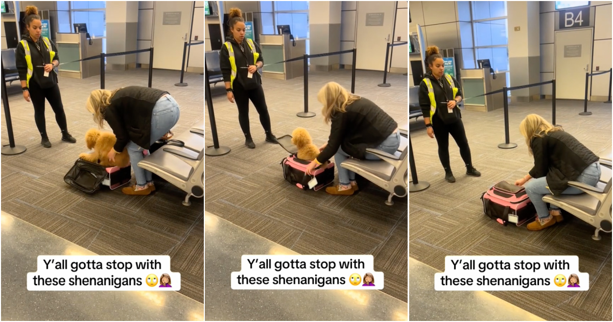 According to airline standards, pets should be transported in a compartment that fits under the passenger seat and allows the animal to move comfortably. In the video, an airport employee explains to the passenger that the used bag does not fulfill these requirements, as the dog seemed clearly too large for the available space.