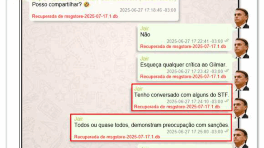 In the exchange of messages of June 27Bolsonaro directed his son to spare Minister Gilmar Mendes from criticism. According to the PF report, Eduardo had sent 3 images to his father (which were not recovered by the organization) and asked if he could share them. Bolsonaro replied, “Forget any criticism of Gilmar.” In the same conversation, the former president said: “I’ve been talking to some of the STF. All or almost all show concern for sanctions”.
