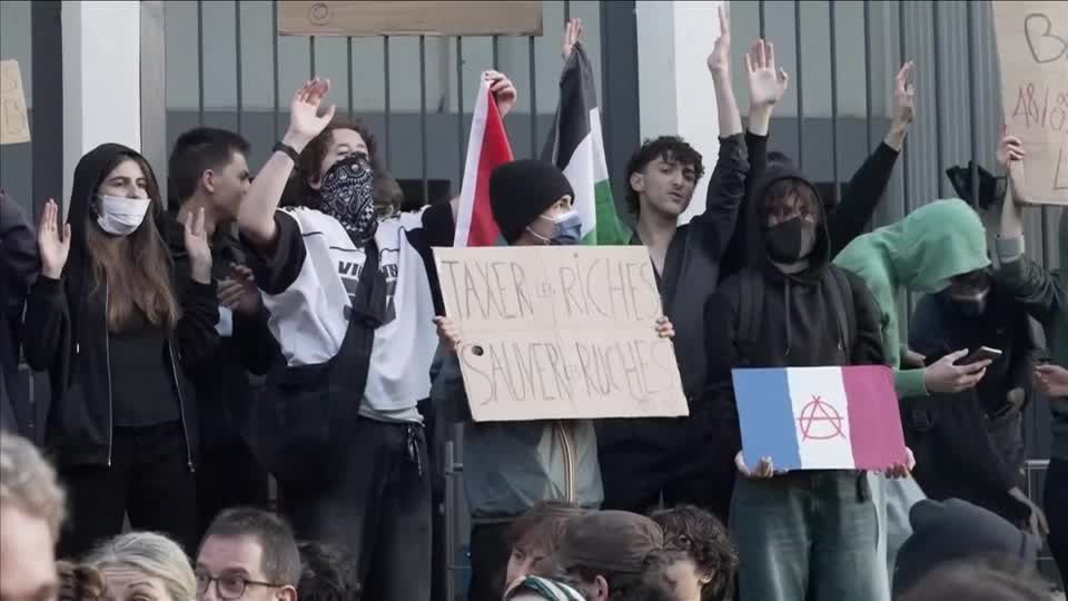A poster said, “Block his school against austerity,” he was erected by a student in front of Maurice Ravel High School in the French capital, where the protest included teachers and workers’ representatives.
