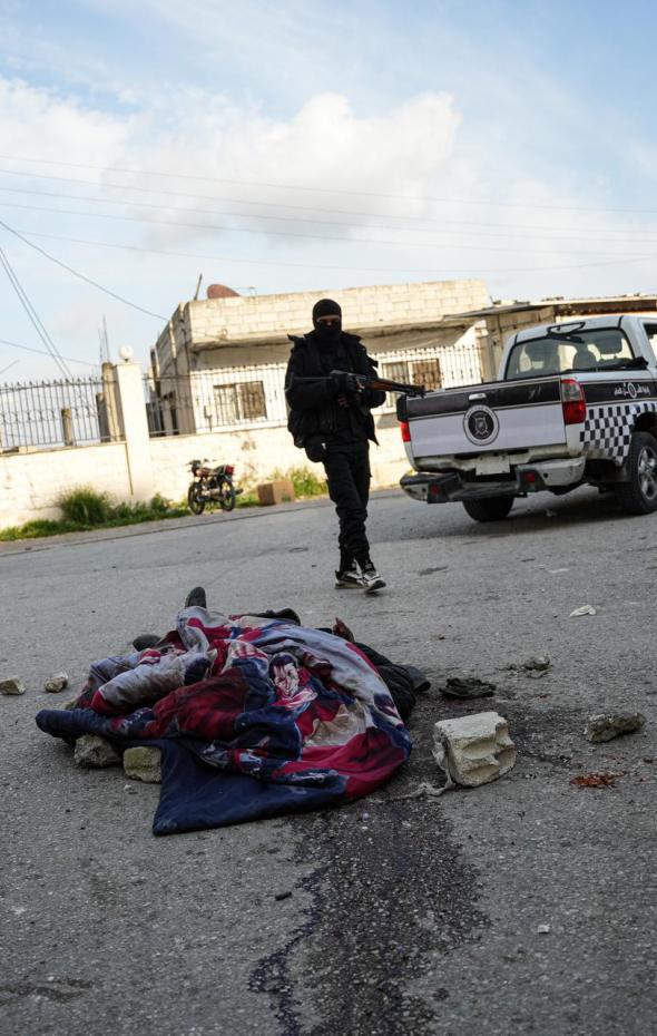 Members of the Syrian Security Forces, together with the body of one of the dead in the operation on Latakia, on March 9, 2025.