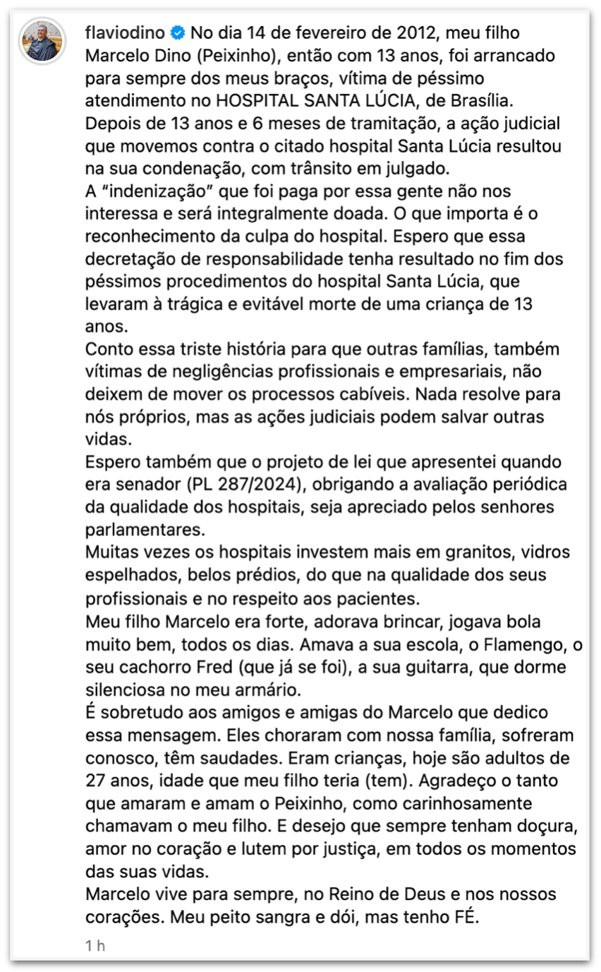 In your on Instagram, Dino stated that “what matters is the recognition of the hospital’s guilt” and what wait “the end of the terrible procedures at Santa Lúcia hospital, which led to the tragic and avoidable death of a 13-year-old child”.