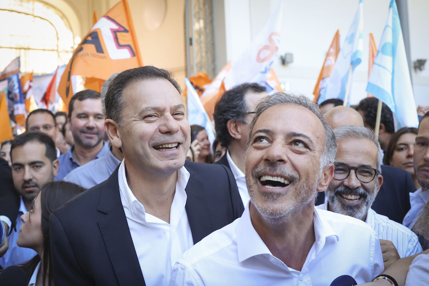 The Prime Minister and president of the Social Democratic Party (PSD), Luís Montenegro (CE), accompanied by the “O Porto Somos Nós” Coalition candidate for Porto City Council, Pedro Duarte (C).
