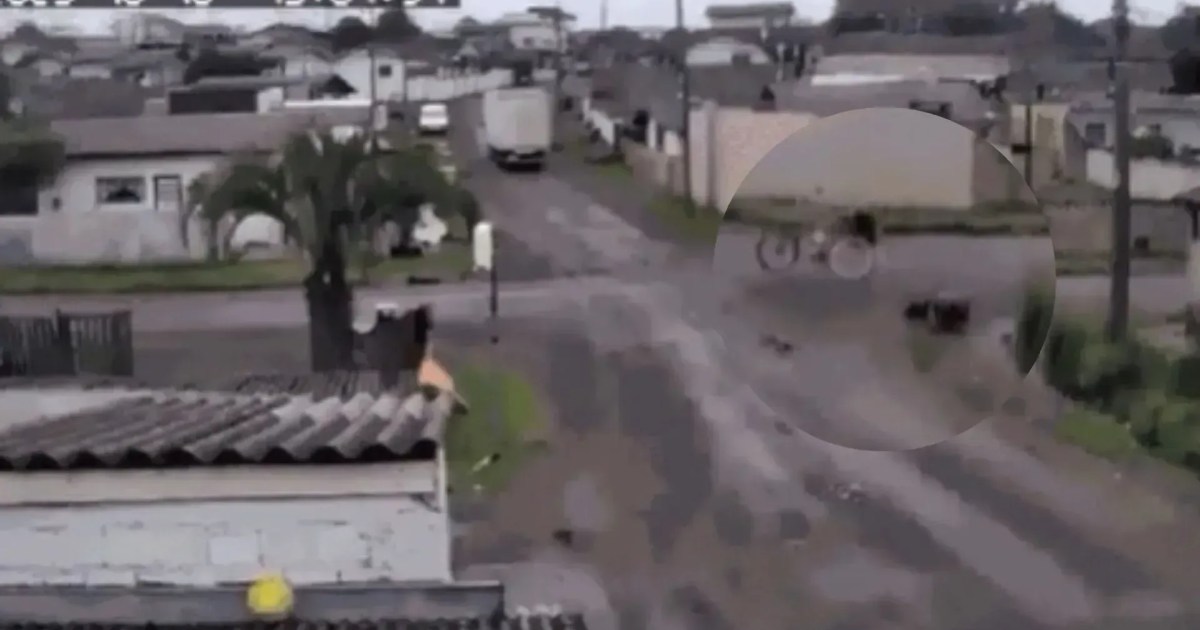 One man was injured after the bike he was riding was dragged by a truck that got tangled in a wire. The accident happened on Rua Cristóvão Colombo, in the Guarujá neighborhood, in Lages (SC), this Thursday (17).