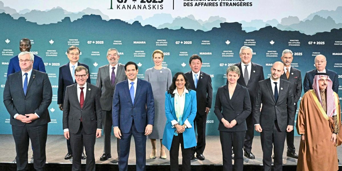 (L/R) South Africa’s Foreign Minister Ronald Lamola, Ukraine’s Foreign Minister Andriy Sybiga, South Korea’s Foreign Minister Cho Hyun, Germany’s Foreign Minister Johann Wadephul, Mexico’s Foreign Minister Juan Ramon de la Fuente, US Secretary of State Marco Rubio, European Union High Representative for Foreign Affairs and Security Policy Kaja Kallas, Canada’s Foreign Minister Anita Anand, Japan’s Foreign Minister Toshimitsu Motegi, Britain’s Foreign Secretary Yvette Cooper, Italy’s Foreign Minister Antonio Tajani, France’s Minister for Europe and Foreign Affairs Jean-Noel Barrot, India’s Foreign Minister Subrahmanyam Jaishankar, Brazil’s Foreign Minister Mauro Vieira and Saudi Arabia’s Foreign Minister Faisal bin Farhan stand for a family photo during the G7 Foreign Ministers’ meeting in Niagara-on-the-Lake, Canada, on November 12, 2025. (Photo by Mandel NGAN / POOL / AFP)