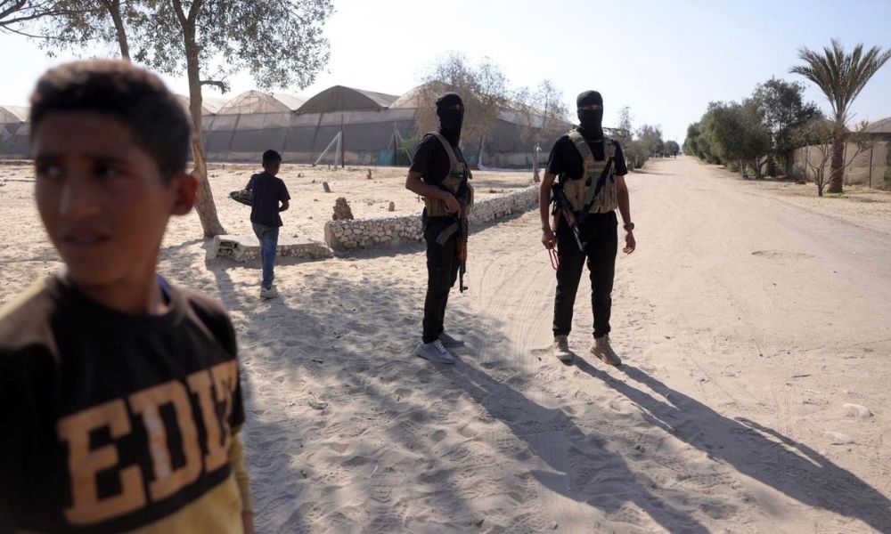 BASHAR TALEB / AFP Palestinian militants wearing bandanas bearing the name of the Ezzedine al-Qassam Brigades, the armed wing of the Palestinian movement Hamas, stand guard before the arrival of International Committee of the Red Cross (ICRC) vehicles south of Deir el-Balah in the center of the Gaza Strip, before handing over the second batch of hostages expected to be freed