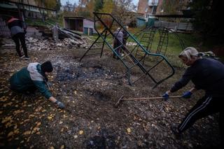 Workers at a daycare center in Sumy collect the fragments of a Russian drone that hit the building, / FRANCISCO RICHART / CONTACT / EUROPA PRESS
