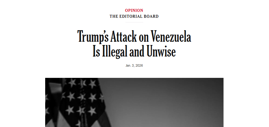 Elsewhere, the text states that “Mr. Trump has not yet offered a coherent explanation for his actions in Venezuela and would be pushing the US into an international crisis without valid reasons. If Mr. Trump wants to argue otherwise, the Constitution defines what he must do: appeal to Congress. Without Congressional approval, his actions violate American law.”