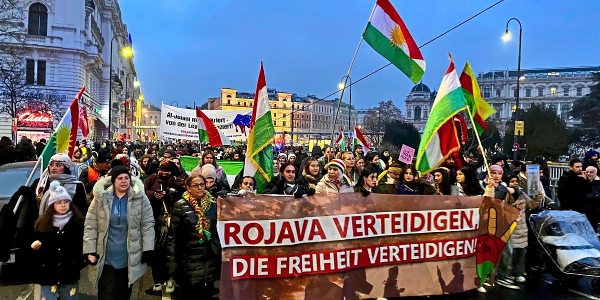 “Freedom for Rojava”, “Peace for Kurdistan” or “Jolani Terrorist” echoed through the university district in Vienna’s ninth district on Saturday afternoon. Almost 4,000 people gathered in Vorivpark from 4 p.m., including a striking number of women, children, families and young people. They want to draw attention to the current situation of the Kurds in Syria and call on the international community to show solidarity. Hundreds of them carry signs and banners with slogans such as “Innocent civilians are being killed,” “The Kurds defended you – world, now it is time to pay the debt,” or “IS is back, Kobanê is under attack.” They accuse Europe and the USA of having abandoned the Kurds and warn of impending genocide.