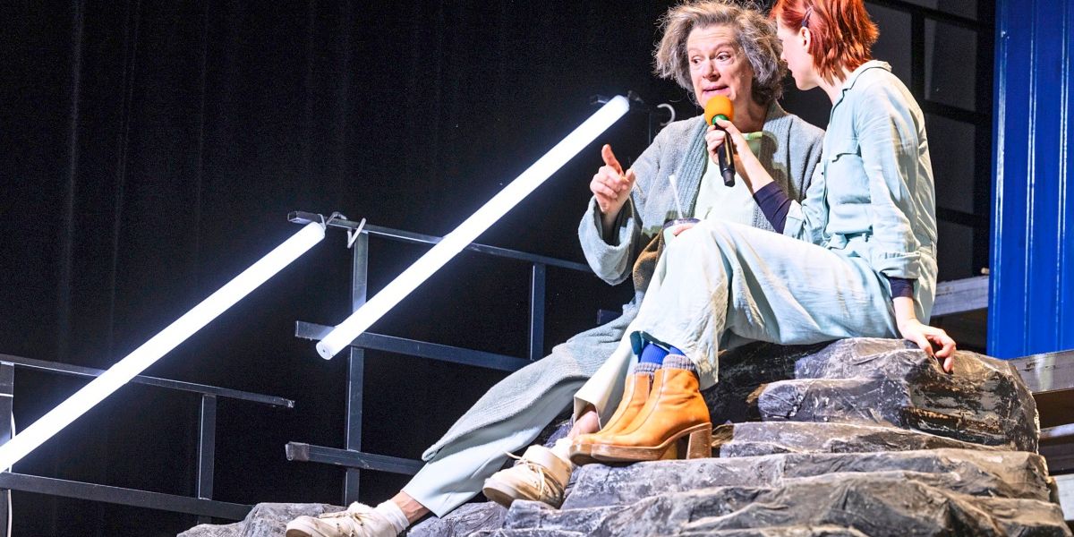 In the cosmic theater the world is coming to an end. Waiting for the end. The last year of the unfortunate dating history of “humanity” and “Earth” has begun, a fling with the rocket to Mars has been forgiven, but humanity has a “smoker’s cough”. A couple bravely holds their ground here and knits dresses with one to eight legs – who knows what the next species on the planet will look like. She should also find memories of us in time capsules. Oh, if only people had recorded birdsong back when that still existed, the neighbor who came along would regret it. On the radio (stage and costumes Michael Lindner) every word of the dictionary is read out again between power blackouts and hits are played, each one for the last time.