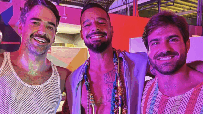 Eduardo Leite and his husband pose with Ricky Martin in a box at Sapucaí