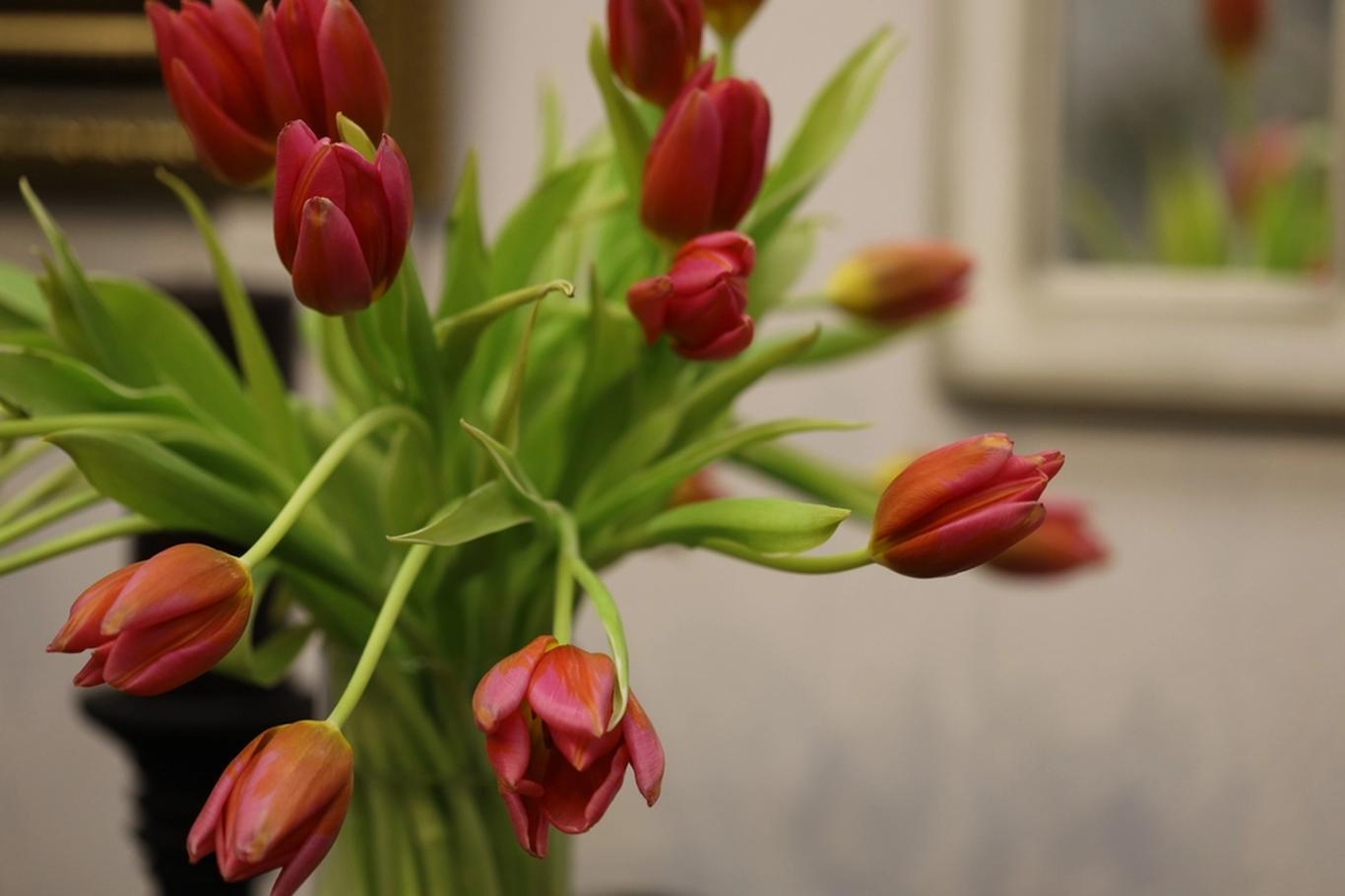 In addition, tulips continue to grow even after being cut and naturally lean towards the light. Therefore, it is good to turn the vase from time to time so that the flowers remain straighter.