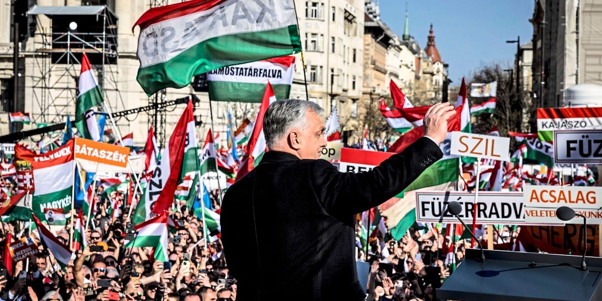 Réka is one of thousands who have been standing on the Margit Bridge, in the middle of the Danube, in the middle of Budapest’s city center, long before the start of the annual “Peace March” on March 15th. Hungarian flags all around them, crowds, even though it hasn’t started yet. She and her boyfriend are also waving Hungarian flags, the sun is shining from the sky. She is also here because of “Béke,” she says – peace, as the word is called in Hungarian.