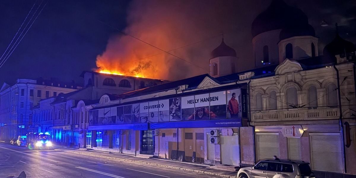 A building burns after being hit by a Russian drone strike, amid Russia’s attack on Ukraine, in central Kharkiv, Ukraine April 2, 2026. Picture taken with a mobile phone. REUTERS/Vitalii Hnidyi